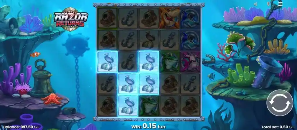 Hráči mají v Razor Returns k dispozici řadu symbolů, které vylepšují hratelnost. Existují dva typy symbolů: běžné symboly a speciální symboly. Periskop, kotva, potápěčská helma a kompas jsou příklady předmětů s nízkou hodnotou spojených s podmořským tématem, které slouží jako běžné symboly. Tyto symboly jsou nezbytné k vytvoření výherních kombinací na 40 výherních liniích. Každý ze žraloků, kteří představují prémiové symboly, má odlišnou výplatní hodnotu. Zlatý žralok je nejcennějším symbolem a může přinést značné výplaty během funkce Razor Reveal. Protože odhaluje skryté odměny, jako jsou multiplikátory a okamžité výhry, je zlatý žralok také klíčový pro maximalizaci potenciálu hry. Dalším důležitým prvkem je symbol wild, který lze použít k dokončení výherních kombinací nahrazením všech ostatních symbolů. Symbol Scatter ve tvaru torpéda je nezbytný pro aktivaci funkce Free Spins. Kolo Free Spins, které má multiplikátory, které se s každým otočením zvětšují, se spustí, když se kdekoli na válcích objeví tři nebo více symbolů Scatter. Výplatní tabulka pomáhá hráčům pochopit jejich potenciální výplaty během běžných otočení a bonusových kol tím, že zobrazuje hodnotu každého symbolu na základě počtu shodných symbolů na výherní linii.